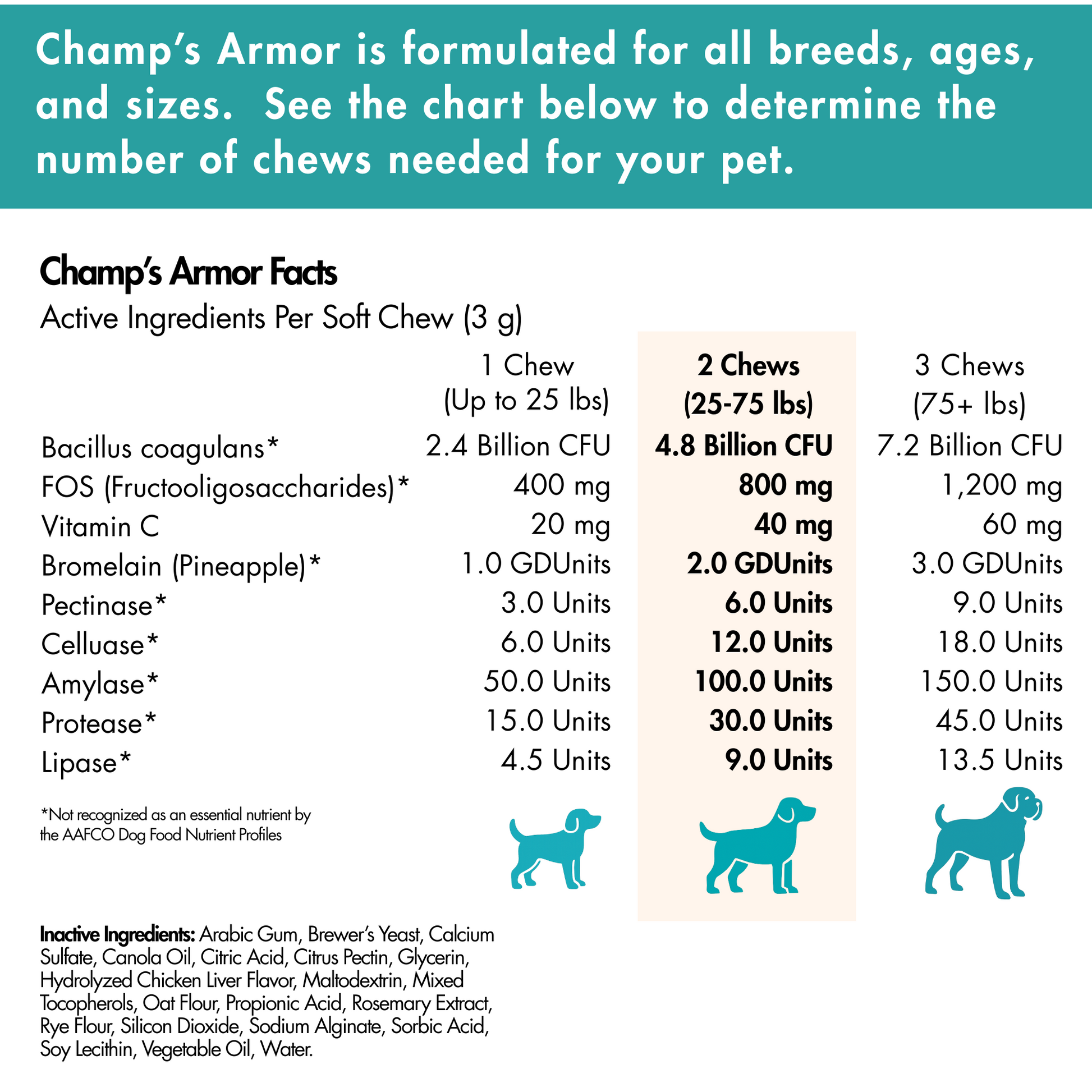 Our extra strength chews contain 2.4 Billion CFU of Bacillus coagulans, a unique, resilient probiotic that withstands stomach acid, allowing it to reach a dog's gut intact